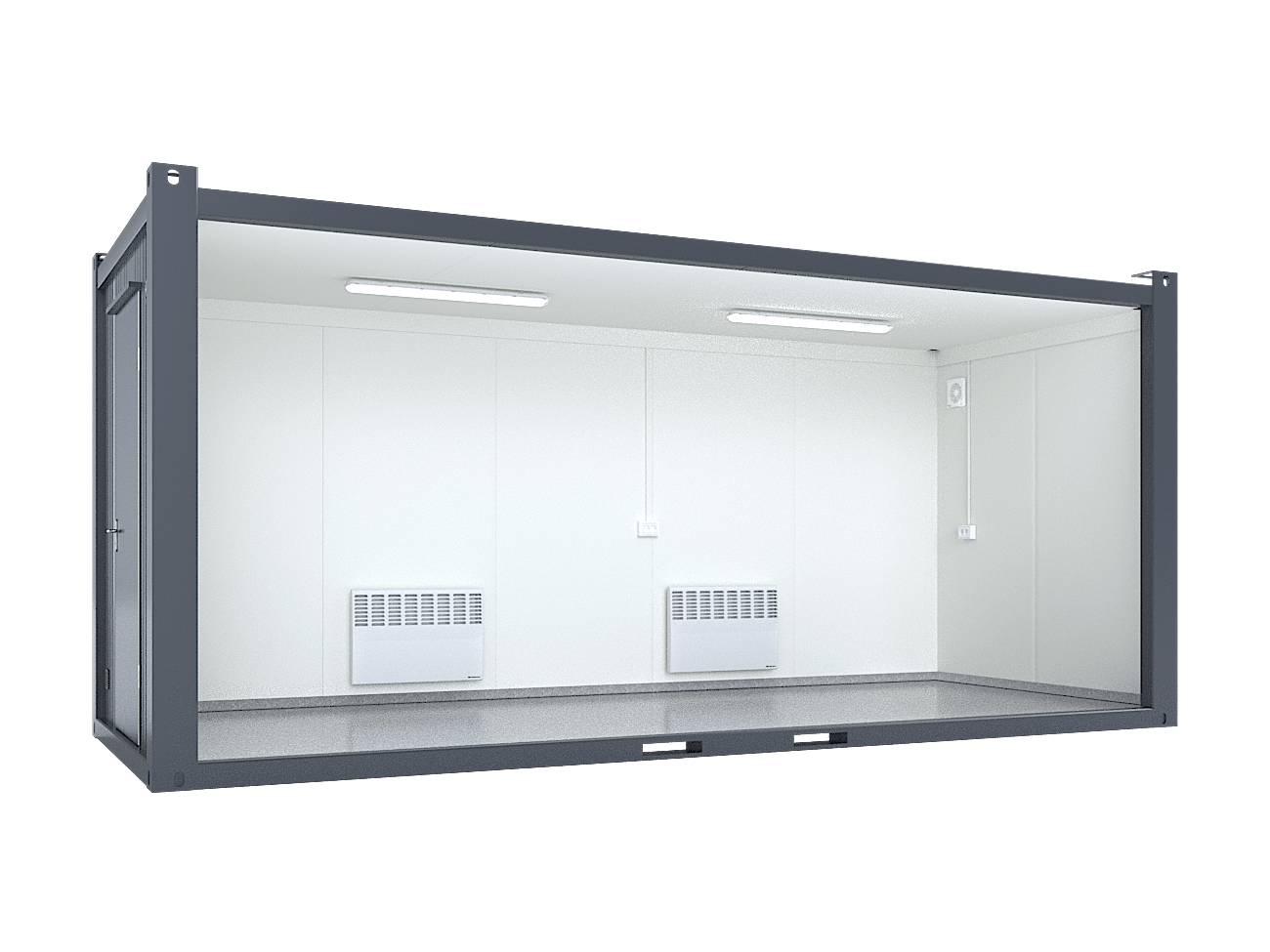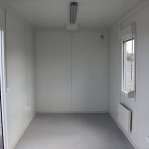 The 20′ (6 m) Office Container is a very high-quality and long-term solution for many uses. This container offers the best price-quality ratio for office containers in Europe and cheap models cannot even compete with it. At about 12 m², the Office Container provides an insulated and heated office, storage or break room space with lights. Standard equipment for the container includes lights, power sockets, windows, ventilation, and excellent thermal insulation suitable for year-round use. The light surfaces create a bright interior. Containers can be combined together to create larger container spaces. The power supply is a 5-pin 32A socket, which can be converted to 16A with an adapter.
