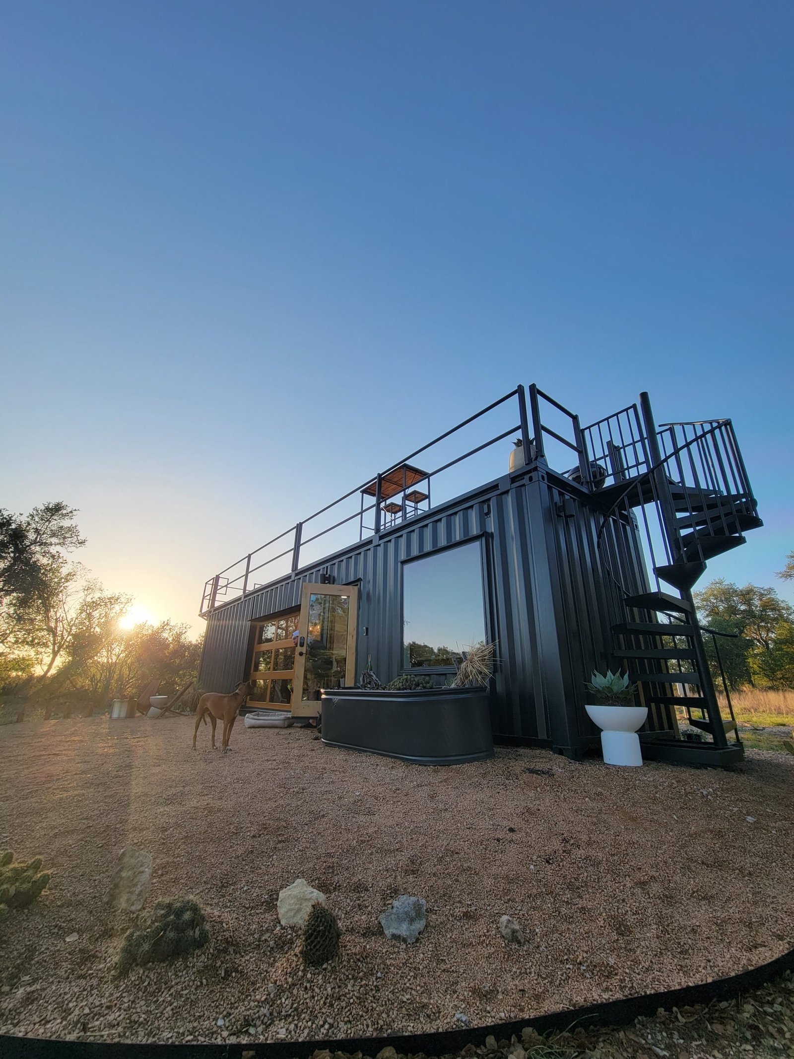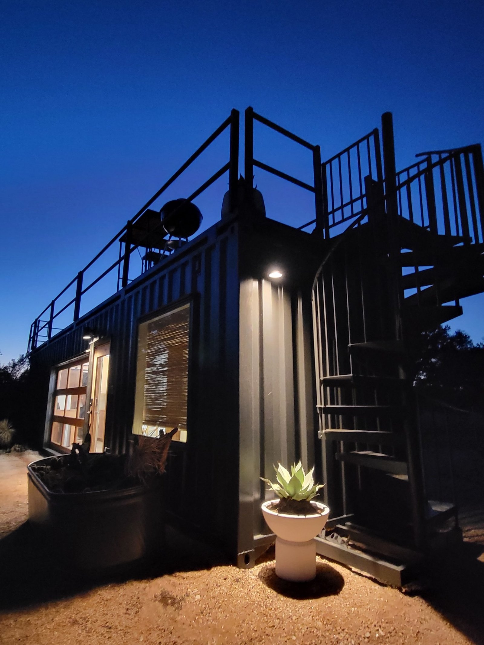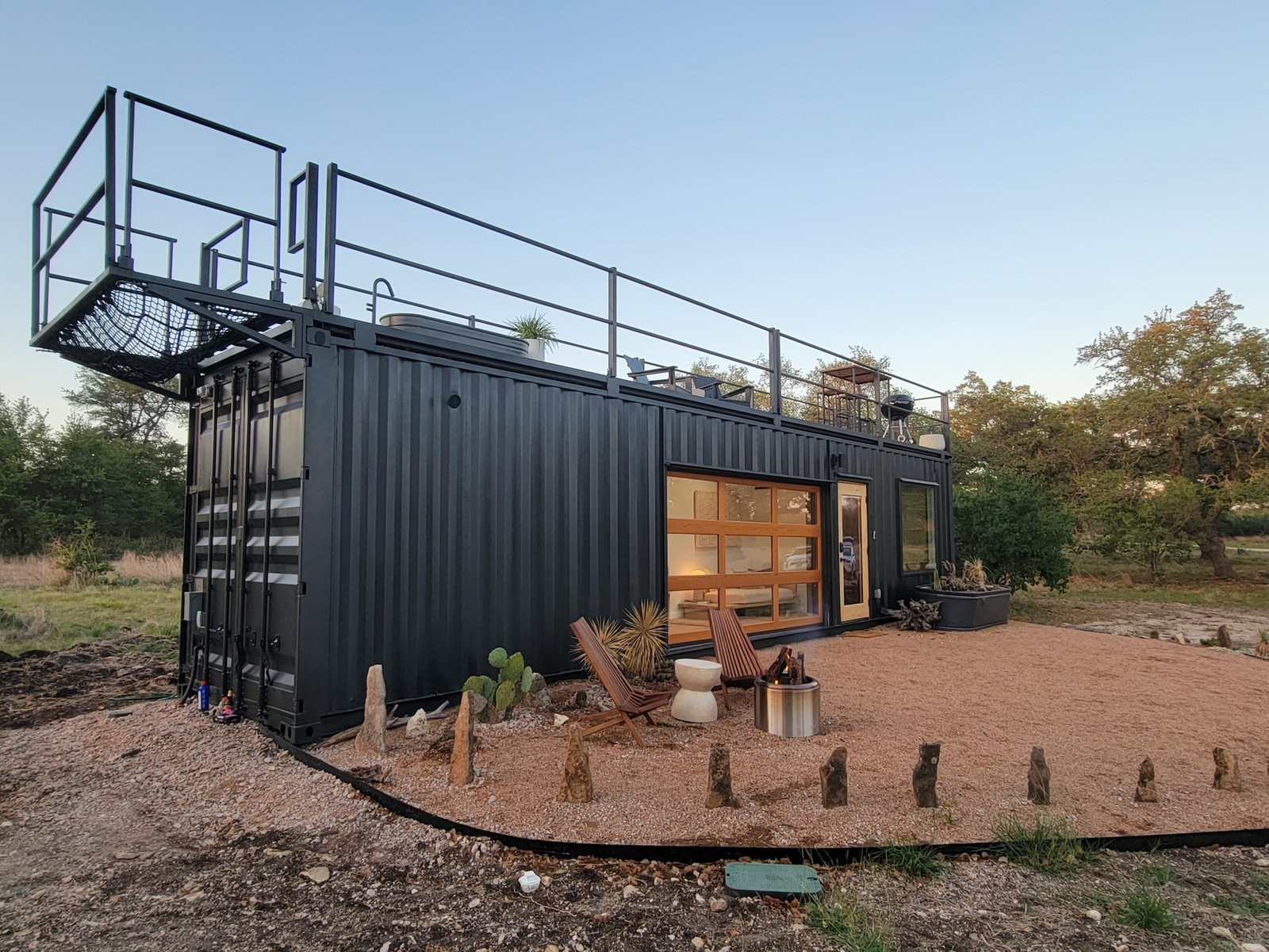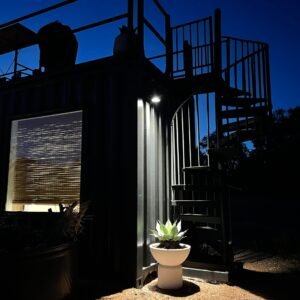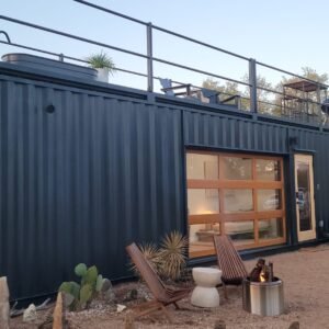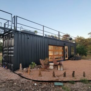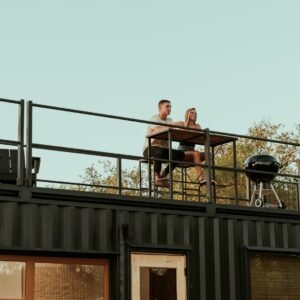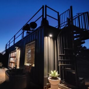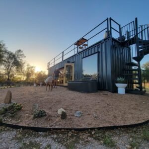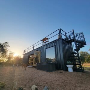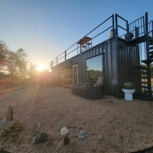 “The Porter” is a premium container home designed for luxury, comfort, and outdoor enjoyment. Featuring a rooftop deck, cowboy hot tub, relaxing hammock, and fully equipped living spaces, it combines modern amenities with a stylish and functional container structure.