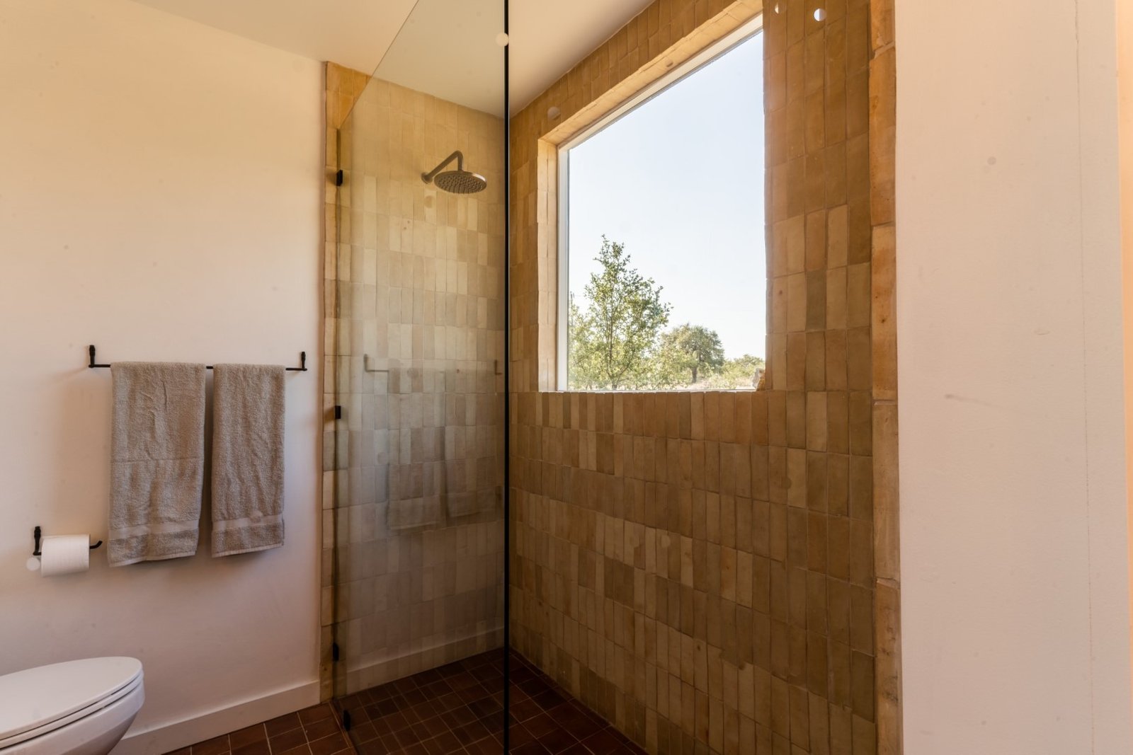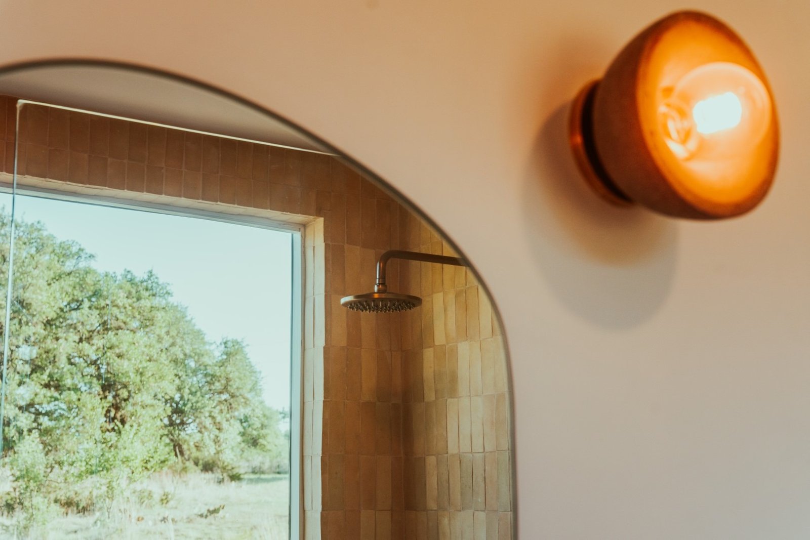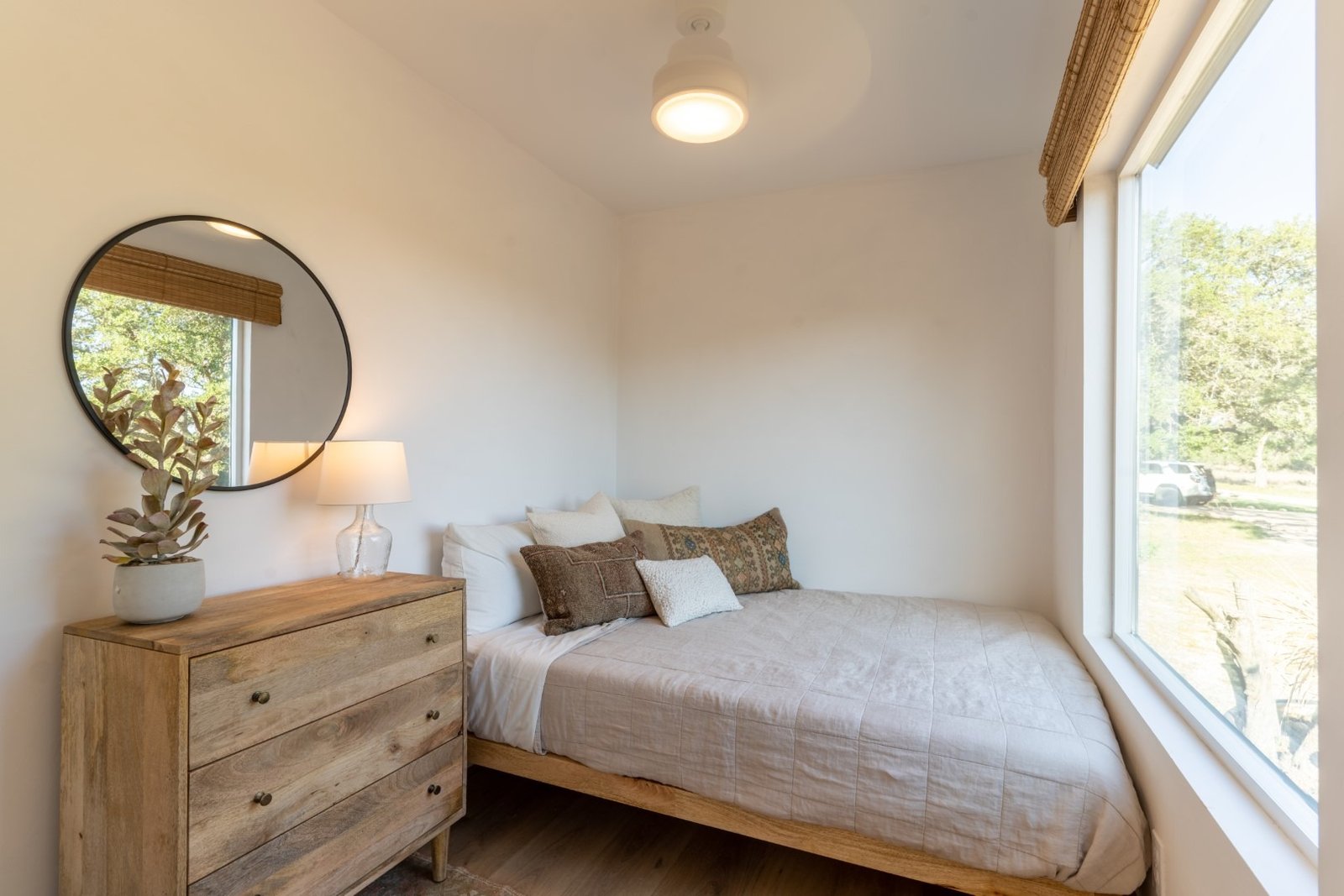 Picture windows in bedroom and bathroom