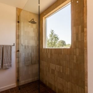 Tile shower 6 ft × 32 in with walk-around glass wall