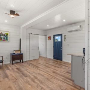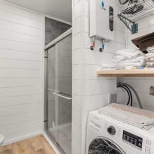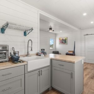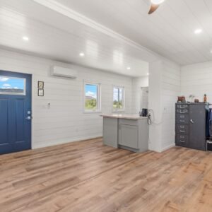 The bathroom features a walk-in shower and a sink with storage. The private, enclosed bedroom can accommodate a queen-size bed. The kitchen includes butcher block countertops with under-counter cabinets and is laid out in an open concept with the adjoining living room, perfect for entertaining!